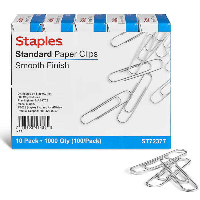 Staples paper clips help you manage your paper trail to keep documents and other pages organized temporarily. The clips feature a smooth finish that prevent tears and snags. The metal is corrosion-resistant to safeguard against discoloration when used in long-term storage. Each box contains 100 paper clips, and there are 10 boxes per pack, so you always have extras on hand for large offices and busy file rooms. Each box stores neatly in a drawer for maximum organization.
