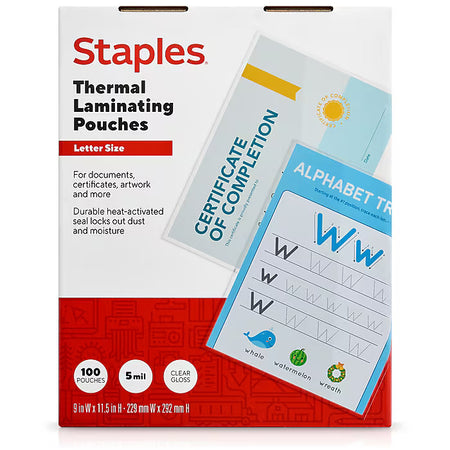 Staples letter-size thermal laminating pouches feature a glossy finish to make your certificates, charts, or announcements more noticeable.