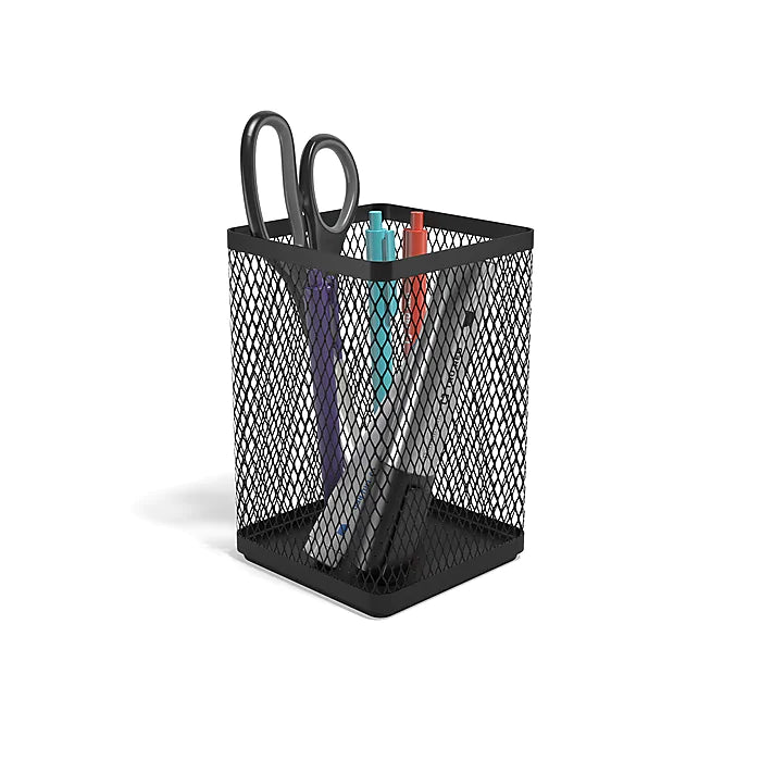Find small office supplies quickly when you keep them inside this jumbo pencil cup. A spacious interior provides ample room and convenient access to writing tools, scissors and a letter opener. The flat square-rounded corners complement the black mesh design, bringing a sophisticated look to your workspace. This TRU RED™ jumbo black mesh pencil cup features reinforced mesh ribbing for long-lasting use.