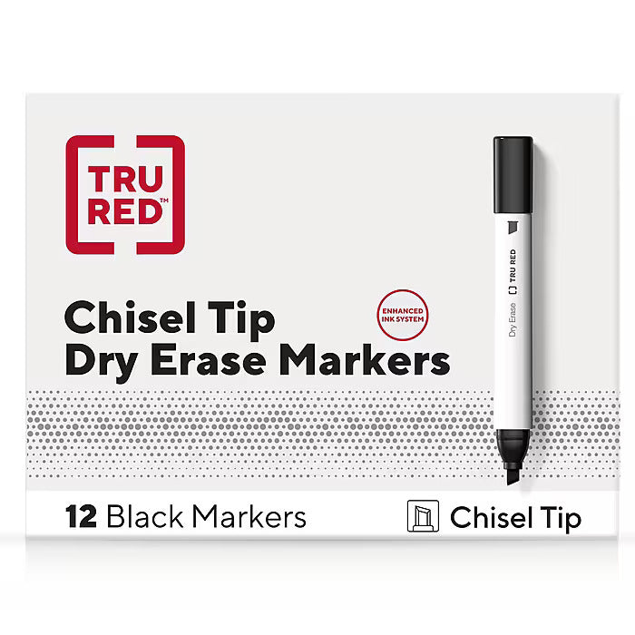 Lead exciting whiteboard brainstorm sessions and lessons in bold black color with this 12-pack of TRU RED™ Dry Erase chisel-tip markers.